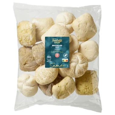 Ingrediënten :20% Wit kaiserbroodje (TARWEBLOEM, water, bakkersgist, aroma, bakkerszout, rijstbloem, aardappelzetmeel, conserveermiddel: E200, TARWEMOUTMEEL, meelverbeteraar: E300), 20% kaiserbroodje met SESAM (TARWEBLOEM, water, 5% SESAMZAAD, bakkersgist, rijstbloem, aardappelzetmeel, aroma, bakkerszout, conserveermiddel: E200, TARWEMOUTMEEL, meelverbeteraar: E300), 20% witte ciabatta (TARWEBLOEM, water, bakkersgist, bakkerszout, aroma, rijstmeel, TARWEMOUTMEEL, conserveermiddel: E200, meelverbeteraar: E300), 20% TARWE-maïs ciabatta (55% TARWEBLOEM, water, zonnebloempitten, 2,7% maïsvlokken, TARWEGLUTEN, 2,0% geëxtrudeerde maïsgries, bakkersgist, bakkerszout, aroma, dextrose, rijstmeel, specerijen, meelverbeteraar: E300, conserveermiddel: E200), 20% meergranen ciabatta (34% VOLKORENTARWEMEEL, water, 22% TARWEBLOEM, 2,3% HAVERVLOKKEN, 2,3% ROGGEVLOKKEN, 2,2% TARWEMEEL, TARWEGLUTEN, 1,2% GERSTEMEEL, bakkersgist, bakkerszout, lijnzaad, aroma, 0,6% gierst, zonnebloempitten, rijstmeel, GERSTEMOUTEXTRACT, 0,2% geroosterde TARWEMOUTMEEL, conserveermiddel: E200, enzymen (TARWE), meelverbeteraar: E300, 0,01% TARWEMOUTMEEL).