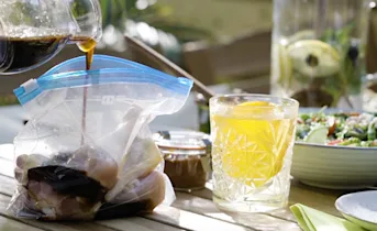 Maak eerst je marinade voor BBQ kip. In de basis bestaat een BBQ kip marinade uit olijfolie, zout en peper, verse knoflook, citroensap en een zoete tegenhanger. Voeg de BBQ kip marinade na het mengen toe aan een hersluitbare zak en plaats de kip erbij. Op deze manier verdeel je de marinade ook makkelijker, blijft het beter zitten en heb je minder nodig. Plaats de hersluitbare zak 4 tot 12 uur in de koelkast voor optimale smaak, zonder dat de textuur van de kip wordt aangetast.