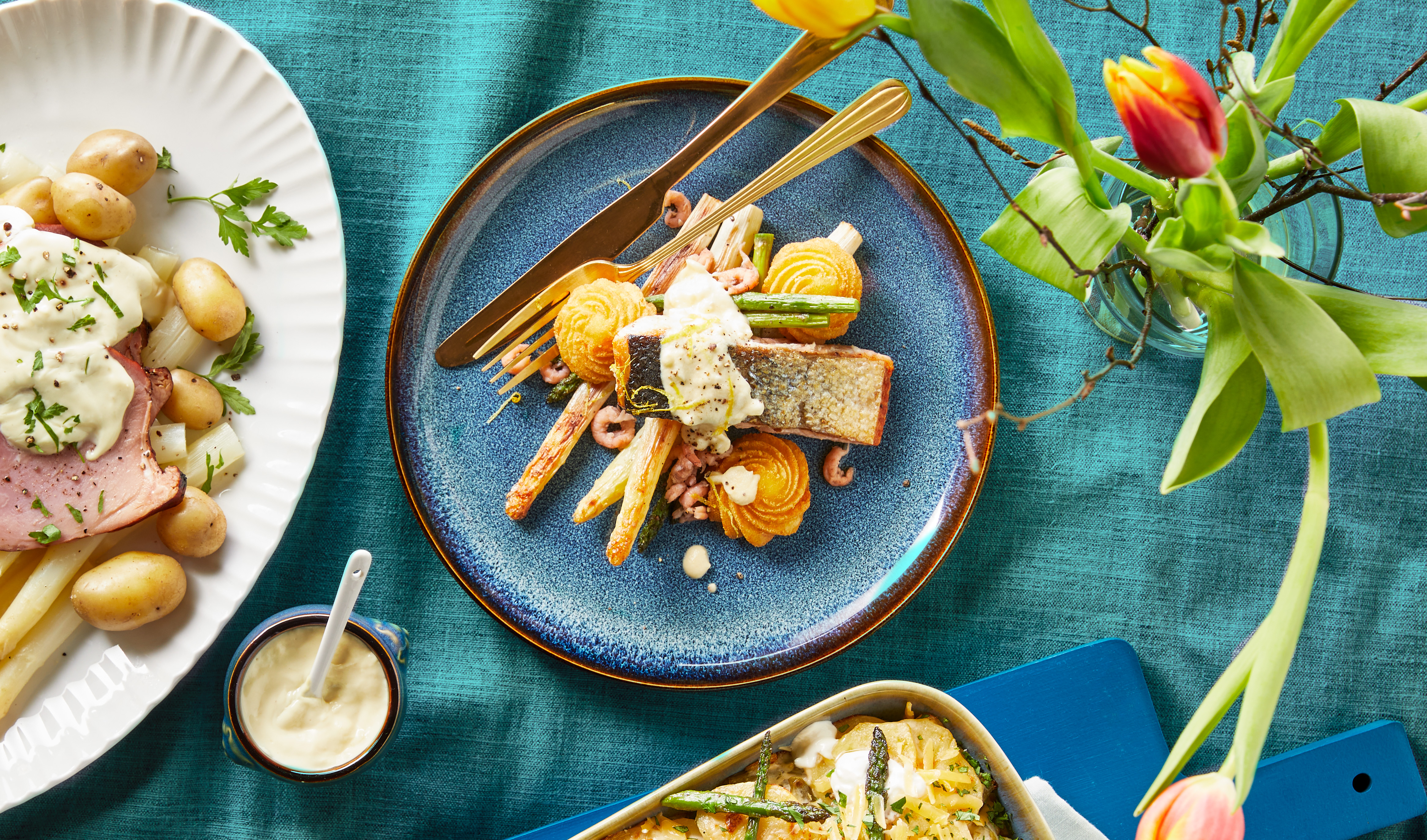 Beenham met witte asperges en hollandaisesaus