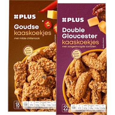 Bijv. PLUS Cheddar kaaskoekjes met uienchutney, 2 pakken à 75 gram van 5.38 voor 4.03.