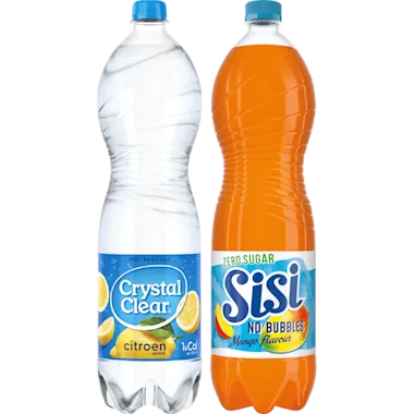 Bijv. Crystal Clear Sparkling lemon, 2 flessen à 1.5 liter van 4.98 voor 2.49.