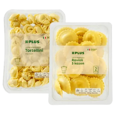 Bijv. PLUS Ravioli 3 kazen, 2 pakken à 250 gram van 4.78 voor 2.39.