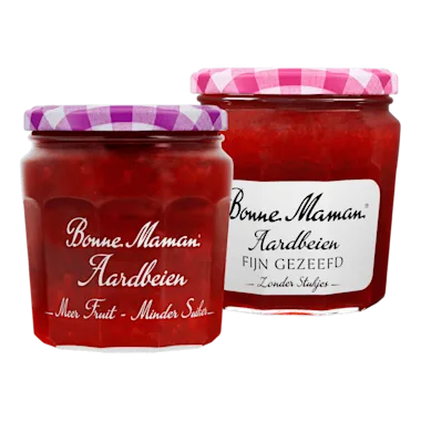 Bijv. Bonne Maman Meer fruit - minder suiker aardbeien, pot 335 gram van 3.99 voor 2.99.
