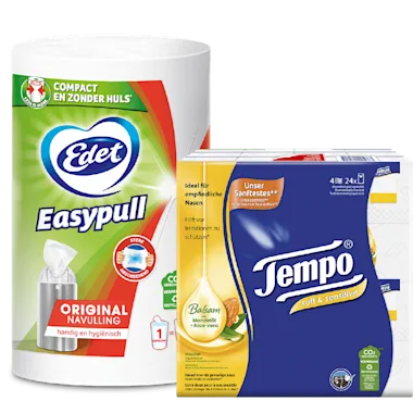 1+1 GRATISTempo zakdoekjes, pak 24 en 30 pakjes en Edet keukenpapier Alle pakken OP=OP