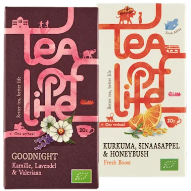 Bijv. Goodnight kamille, lavendel & valeriaan, 2 dozen à 20 stuks van 6.58 voor 3.29.