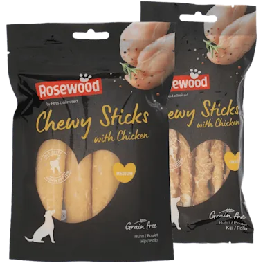 Bijv. Rosewood Chewy sticks chicken, 2 zakken à 4 stuks van 6.98 voor 3.49.
