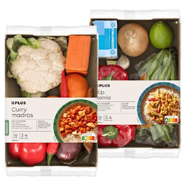 Bijv. PLUS Verspakket curry madras, per stuk van 5.49 voor 4.49.