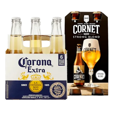 Bijv. Corona Mono, set 6 flesjes à 33cl van 9.99 voor 7.50.