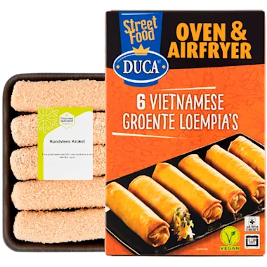 Bijv. Duca Oven & airfryer Vietnamese groente loempia's, doos 6 stuks van 2.39 voor 1.79.