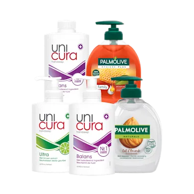 Bijv. Unicura Handzeep balance, 5 flacons à 250 ml van 16.45 voor 6.58.