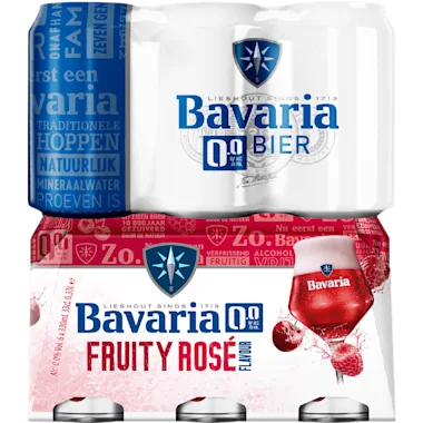 Bijv. Bavaria 0.0% fruity rosé, 2 sets met 6 blikjes à 33 cl van 11.50 voor 5.75. van 11.50 voor 5.75.