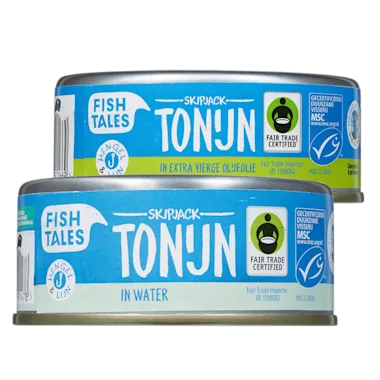 Bijv. Fish Tales Skipjack tonijn in water, 2 blikken à 160 gram van 7.58 voor 5.68.