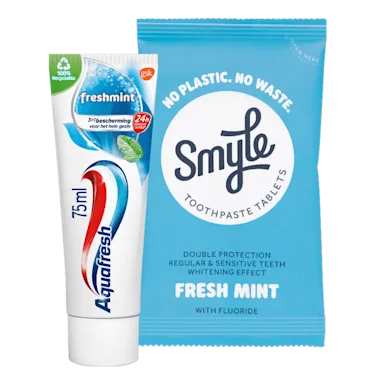 Bijv. Aquafresh Tandpasta freshmint 3 maal bescherming, 2 tubes à 75 ml van 2.98 voor 1.49.