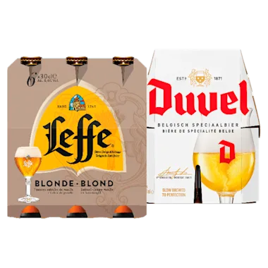 Bijv. Leffe Blond, set 6 flesjes à 30 cl van 8.65 voor 6.49.