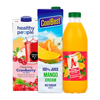 Bijv. Coolbest Sap mango dream, pak 1 liter van 3.39 voor 2.37.