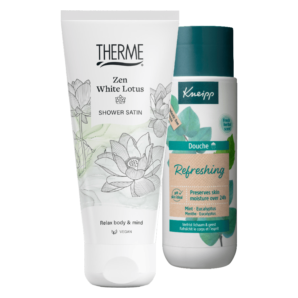Bijv. Therme Zen white lotus shower satin, 2 flessen à 200 ml van 13.58 voor 6.79.