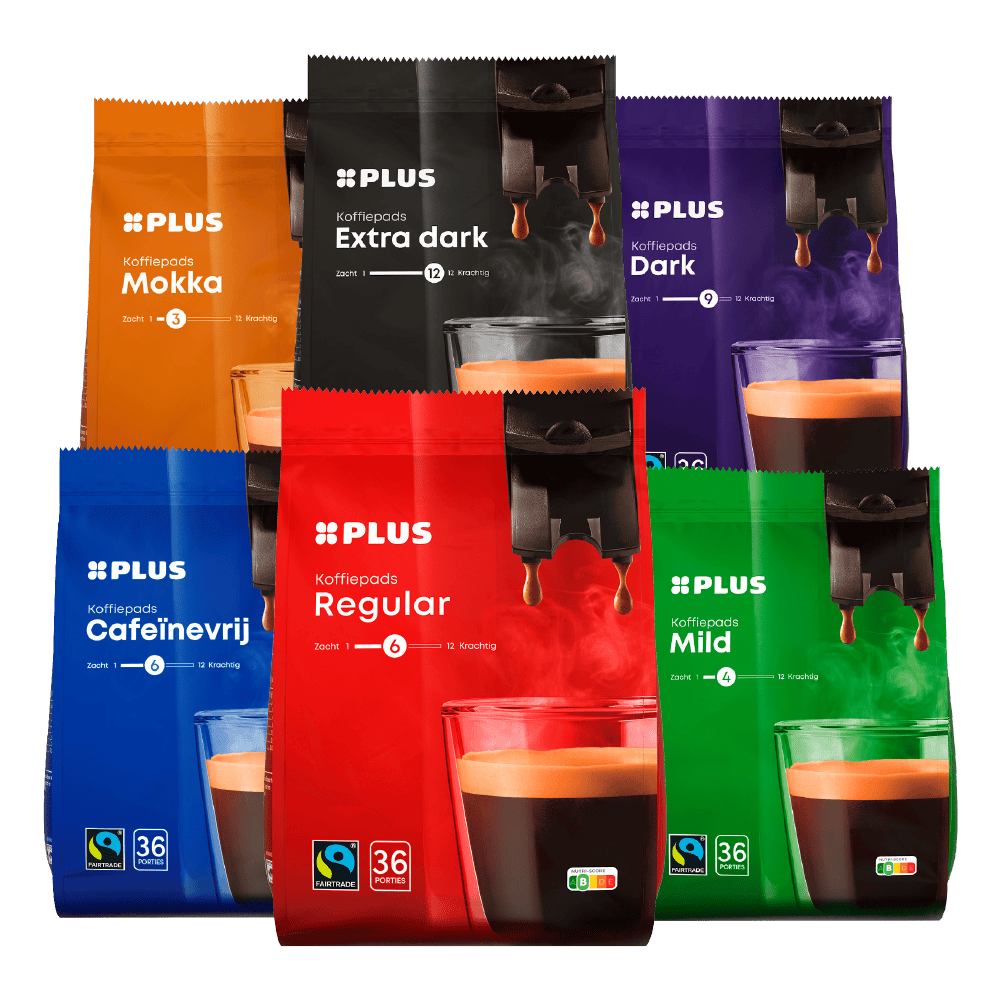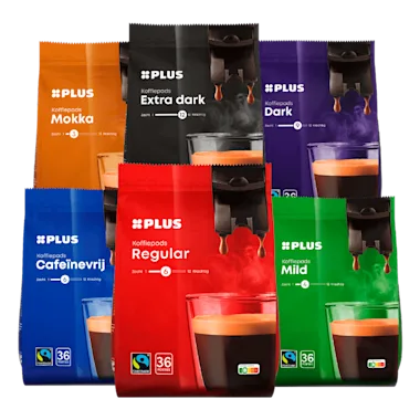 Bijv. Koffiepads regular, 2 zakken à 36 stuks van 11.98 voor 5.99.