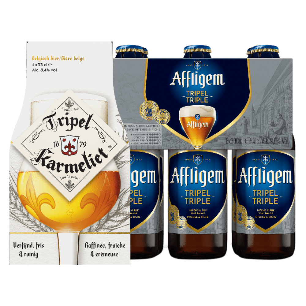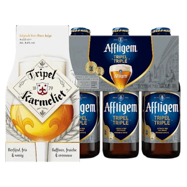 Bijv. Tripel Karmeliet, set 4 flesjes à 33 cl van 8.79 voor 6.60.