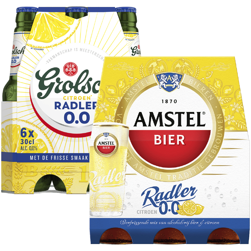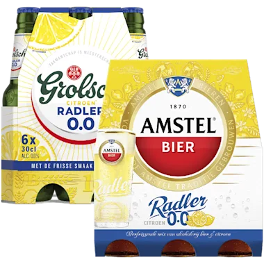 Bijv. Amstel Radler citroen 0.0%, set 6 flesjes à 30 cl van 5.79 voor 2.89.