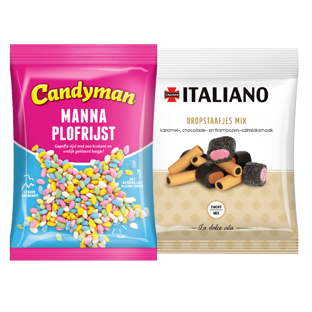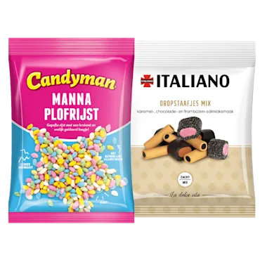 Bijv. Candyman Manna plofrijst, zak 200 gram van 1.99 voor 1.59.