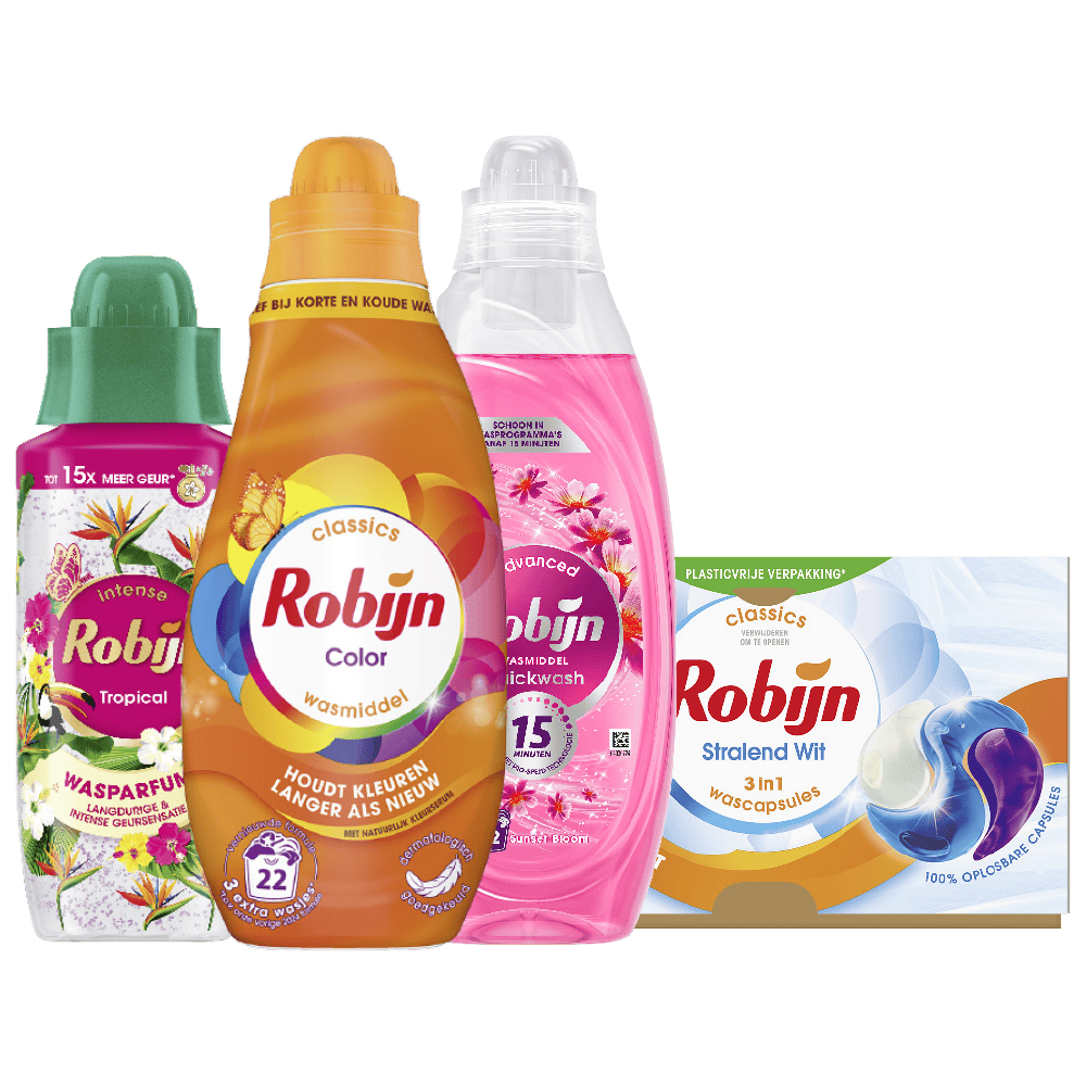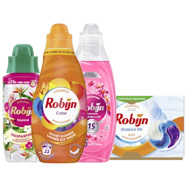 Bijv. Klein & krachtig color, 2 flessen à 22 wasbeurten van 35.98 voor 17.99.