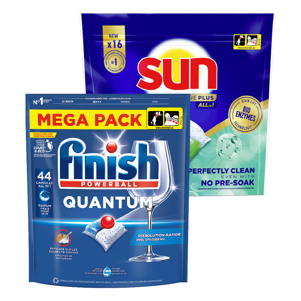 Bijv. Finish Quantum regular vaatwascapsules, 2 zakken à 44 stuks van 41.18 voor 20.59.