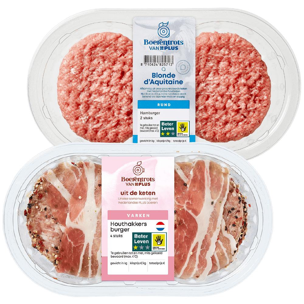 Boerentrots van PLUS Houthakkers- en Blonde d'Aquitaine Hamburgers en PLUS Runderhamburgers