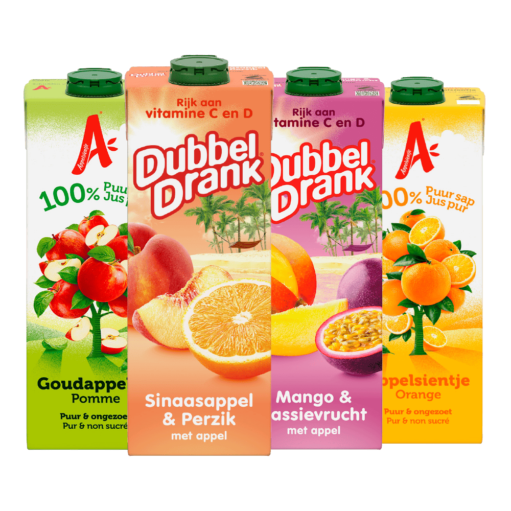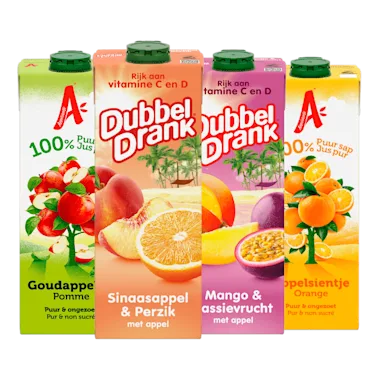 Bijv. Dubbeldrank Sinaasappel & perzik, 2 pakken à 1 liter van 4.98 voor 2.49.