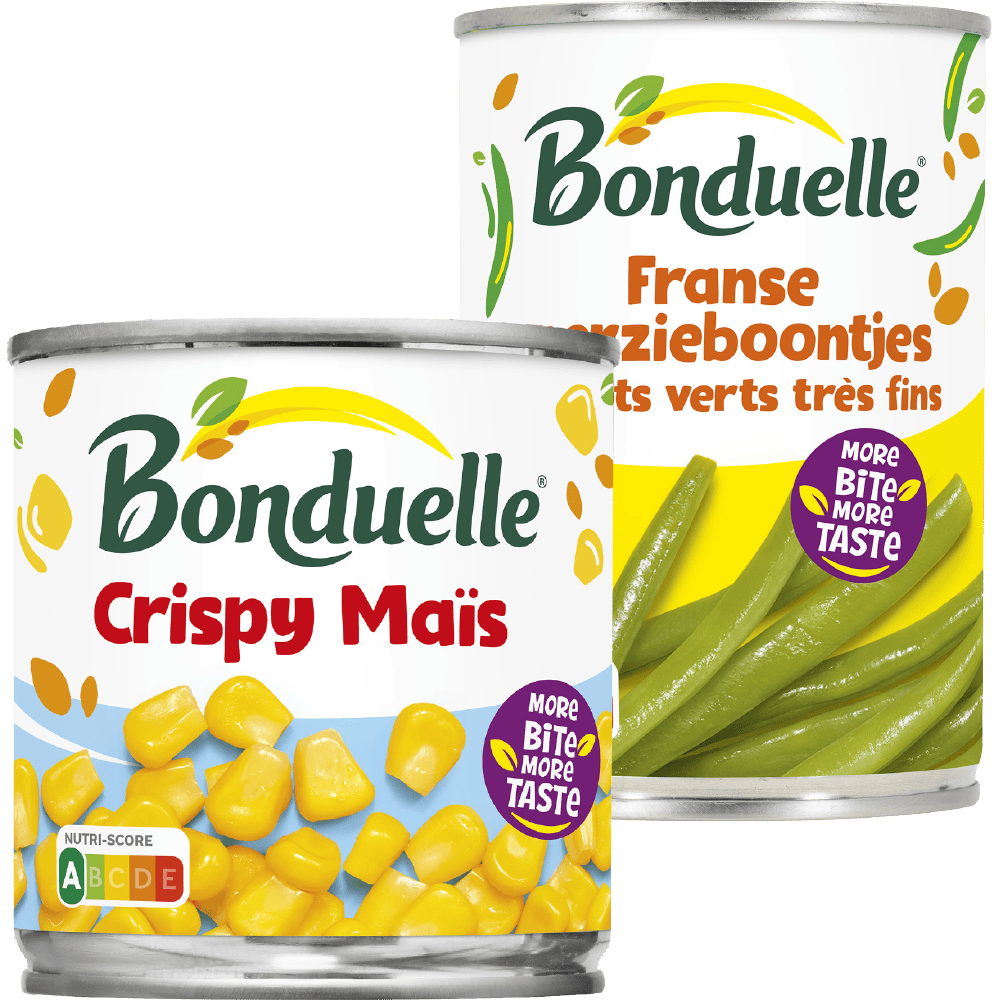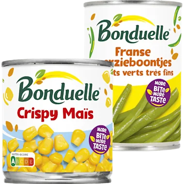 Bijv. Crispy maïs, 2 blikken à 300 gram van 4.18 voor 2.09.