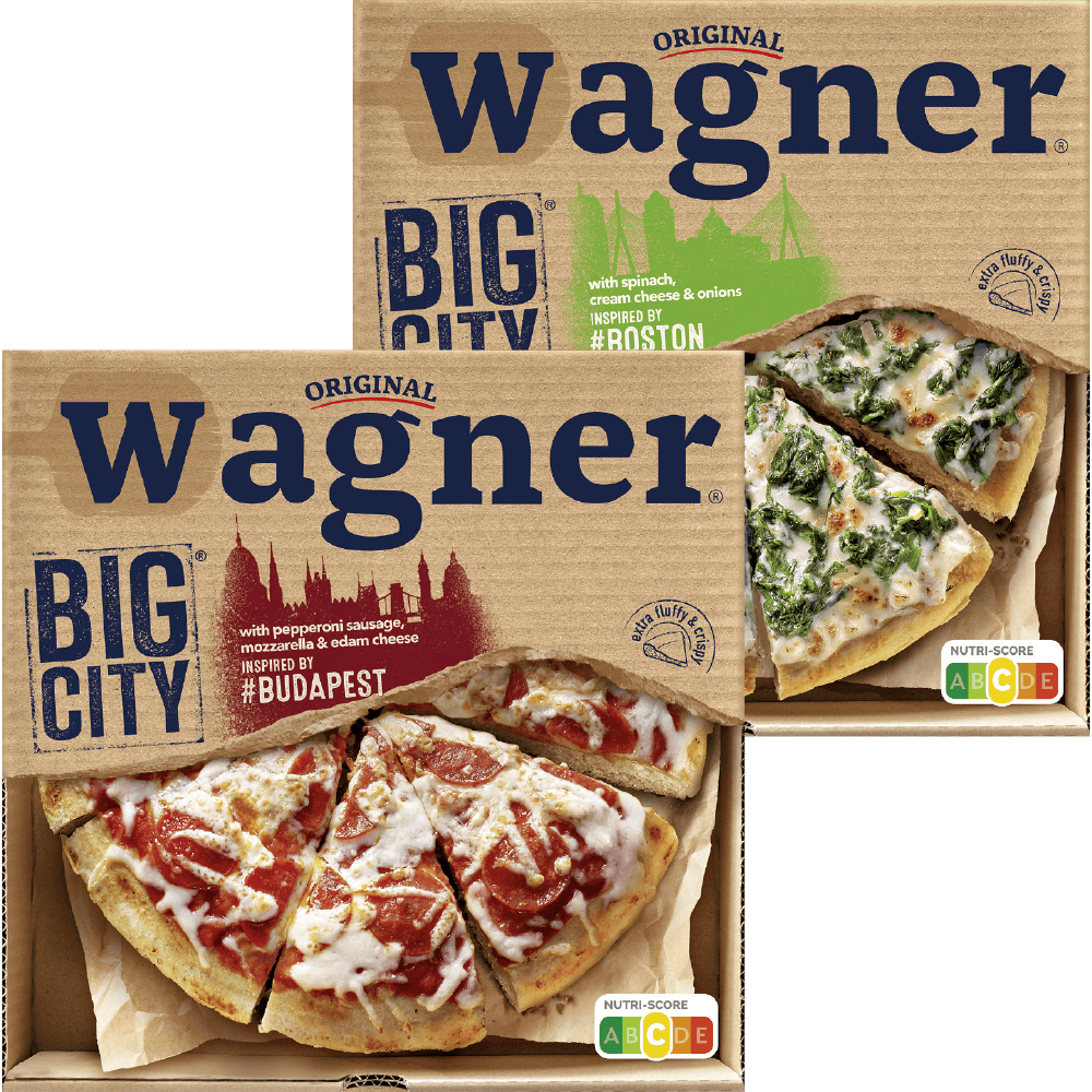 Bijv. Big city pizza Budapest pepperoni, 2 dozen à 400 gram van 7.98 voor 3.99.
