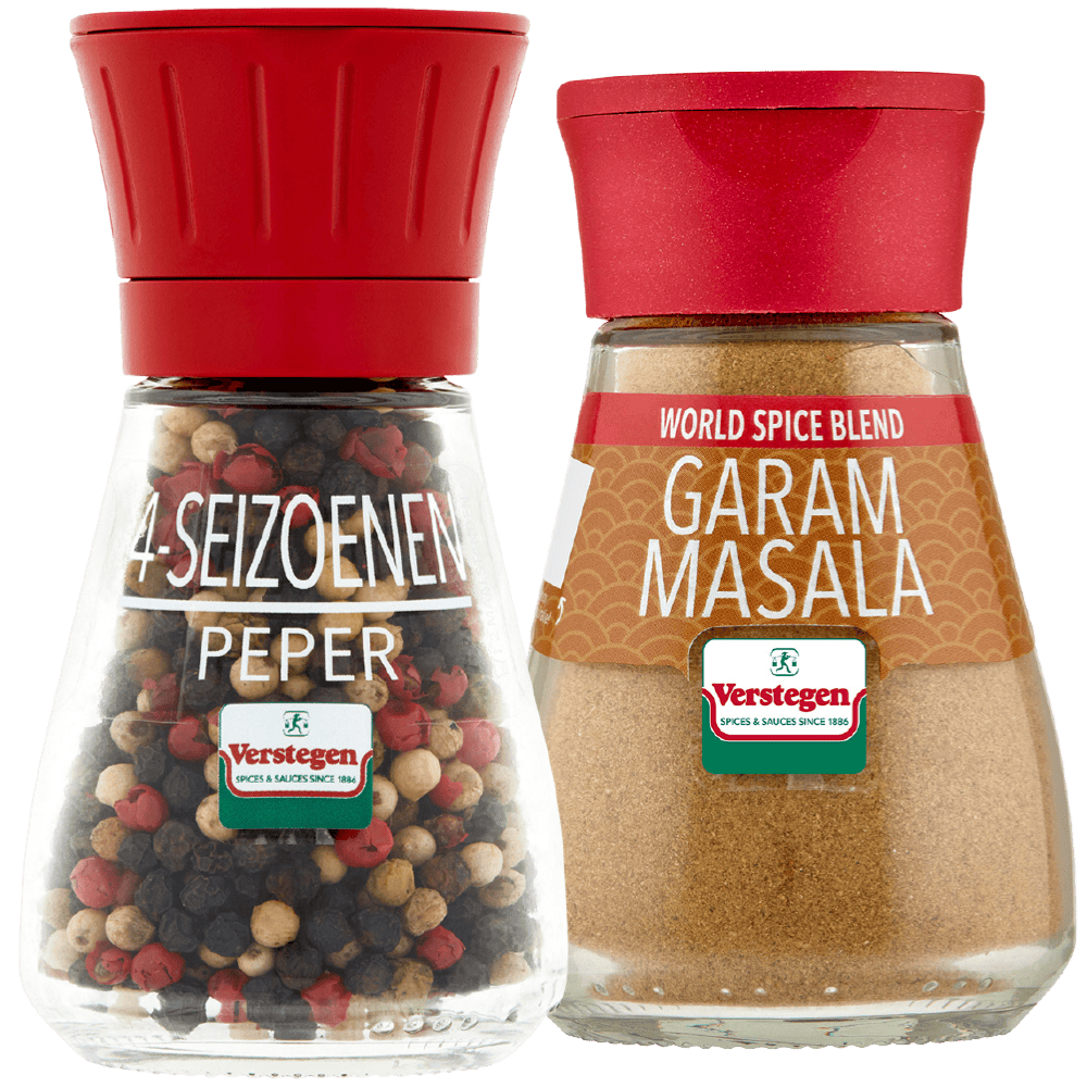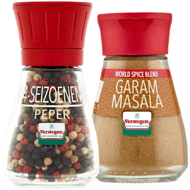Bijv. Verstegen 4 Seizoenenpeper, 2 potten à 43 gram van 6.90 voor 3.45.