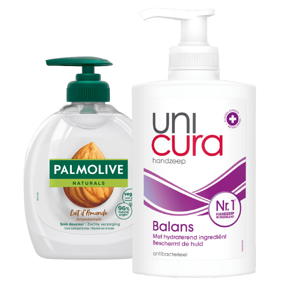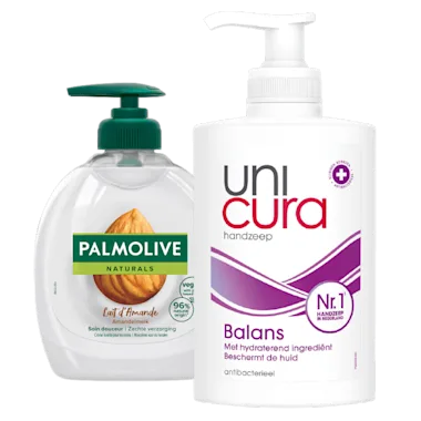 Bijv. Unicura Handzeep balance pomp, 2 flessen à 250 ml van 6.18 voor 3.09.