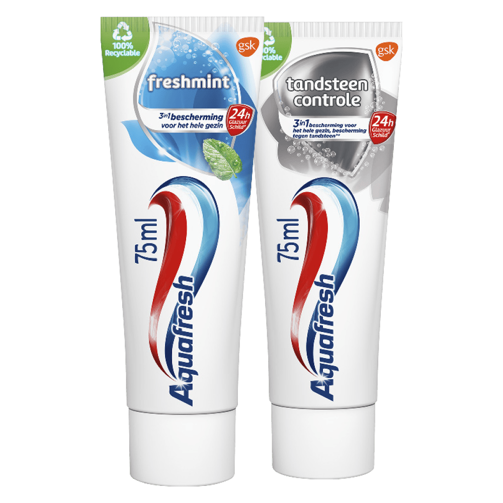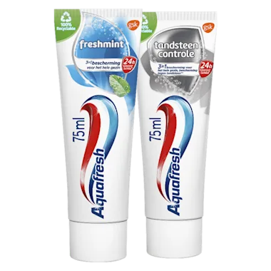 Bijv. Tandpasta freshmint 3in1 bescherming, 2 tubes à 75 ml van 3.18 voor 1.59.