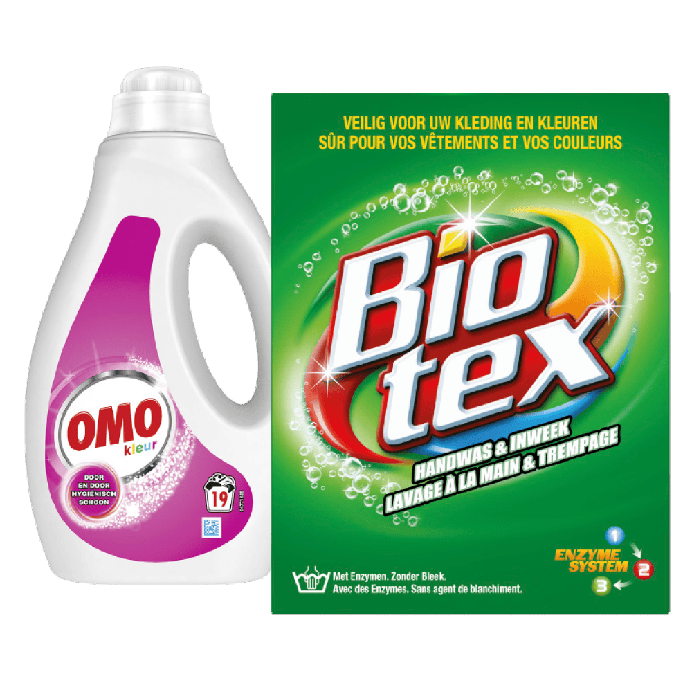 Bijv. Biotex Handwas & inweek poeder, 2 dozen à 720 gram van 12.98 voor 6.49.