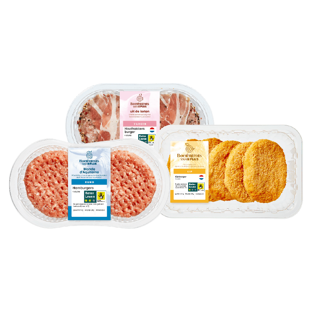 Boerentrots van PLUS Blonde d'Aquitaine Hamburgers, houthakkers- en kipburgers