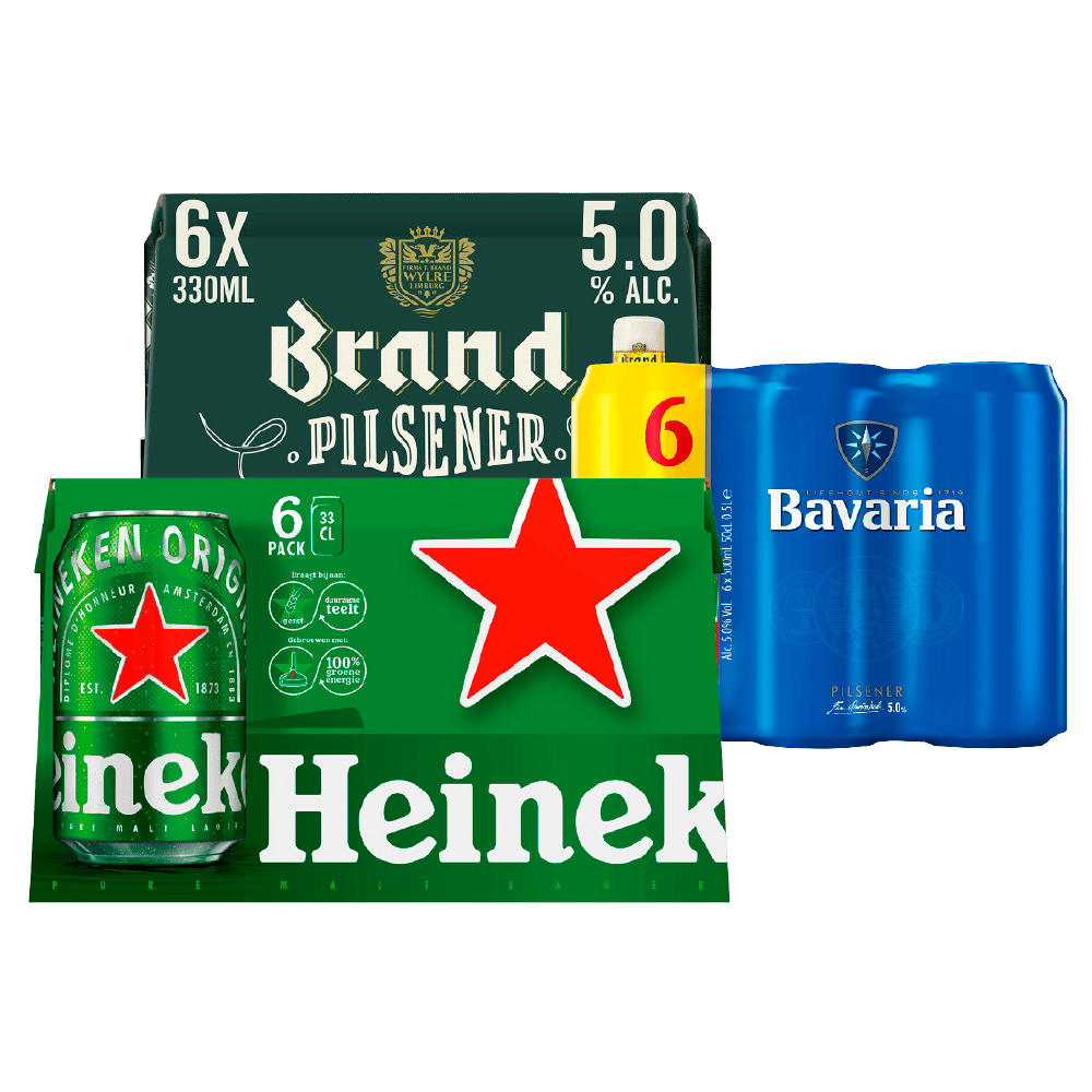Bijv. Heineken Pils, set 6 blikjes à 33 cl van 6.99 voor 5.25.