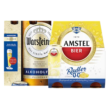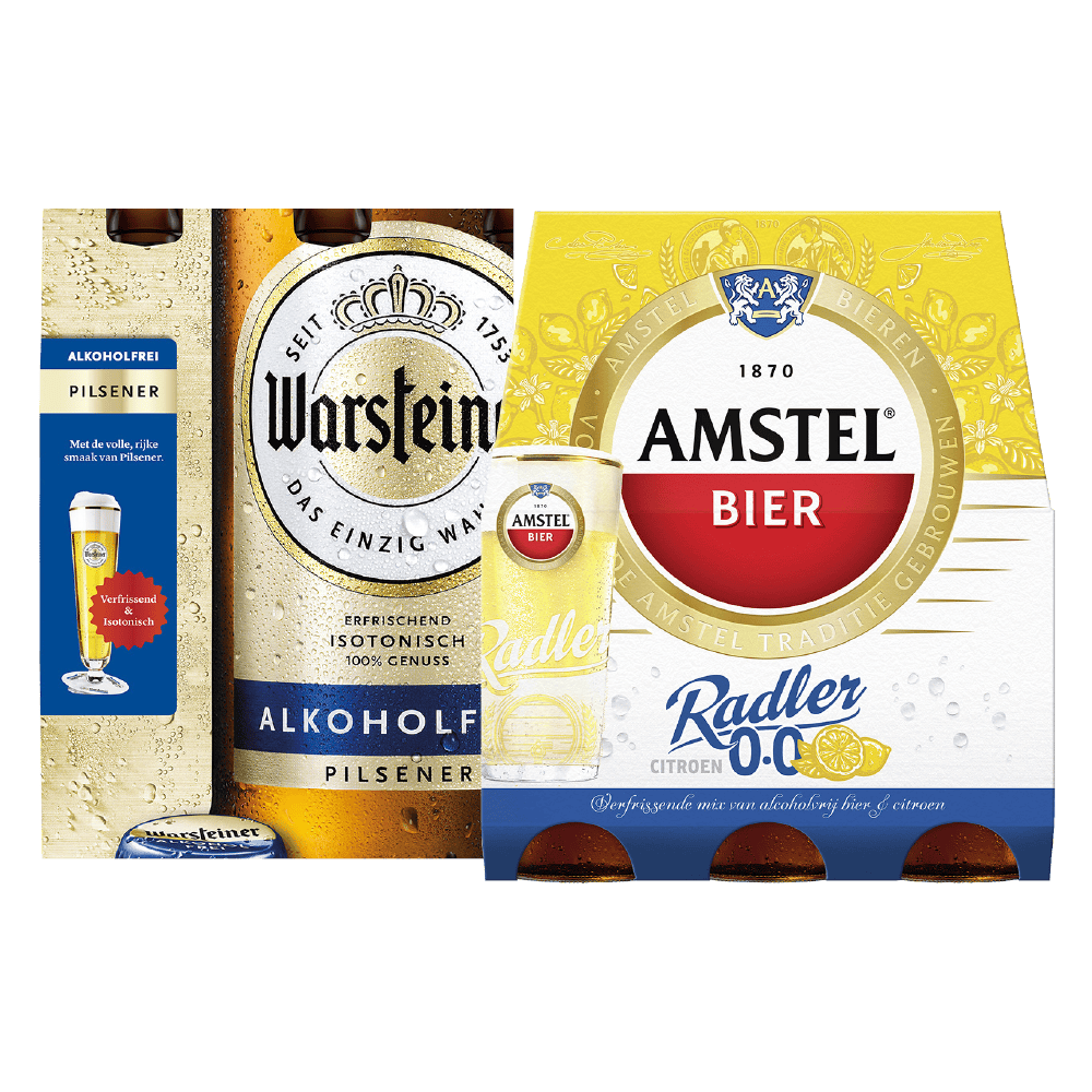 Bijv. Amstel Radler citroen 0.0%, 2 sets met 6 flesjes à 30 cl van 11.58 voor 5.79.