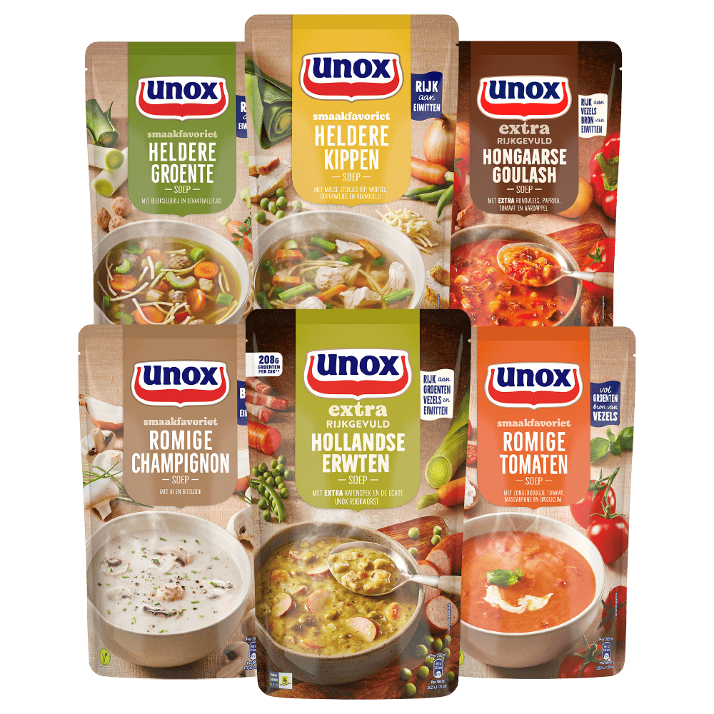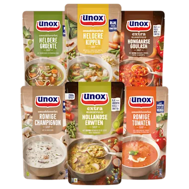 Bijv. Hollandse erwtensoep, 2 zakken à 570 ml van 6.70 voor 3.35.
