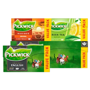 Bijv. Pickwick English zwarte thee original, doosje 40 stuks van 2.49 voor 1.86.