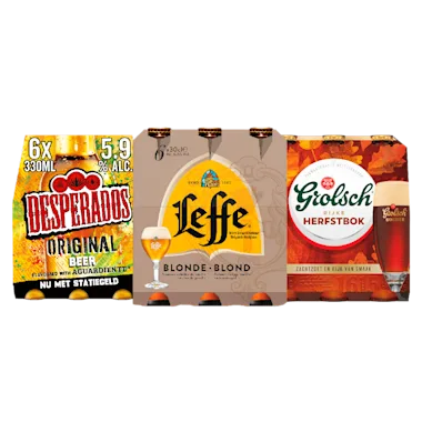 Bijv. Leffe Blond Belgisch abdijbier, set met 6 flesjes à 30 cl van 8.65 voor 6.49.