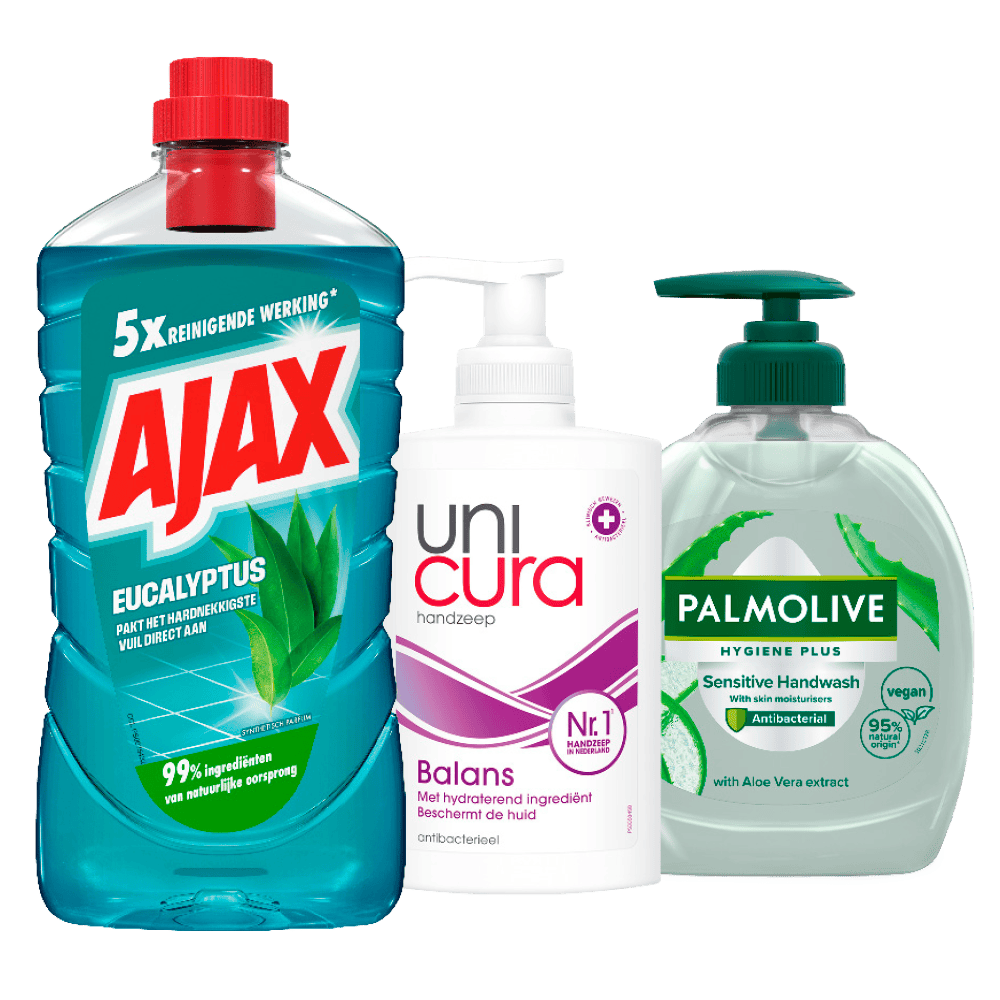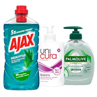 Unicura en Palmolive Handzeep en Ajax Allesreiniger