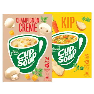 Bijv. Champignon crème, 4 dozen à 3 zakjes van 7.16 voor 3.58.
