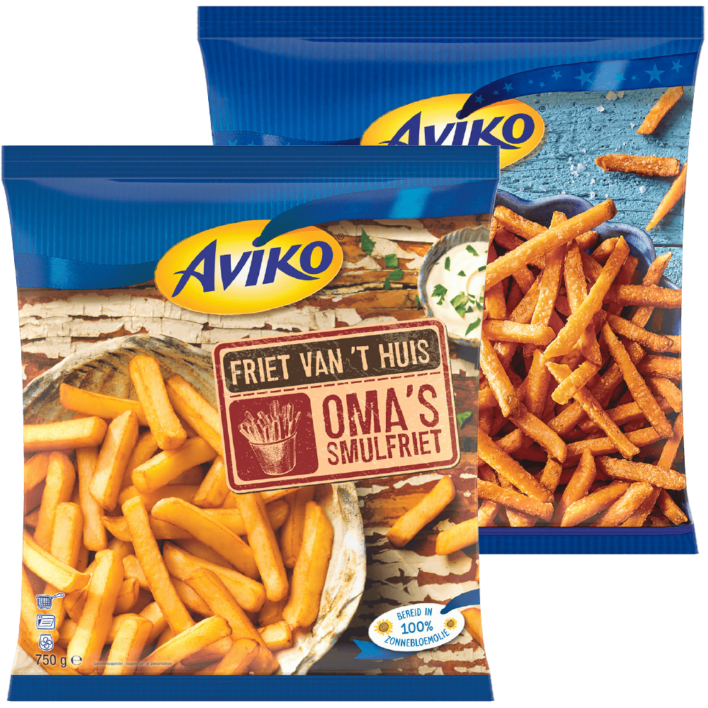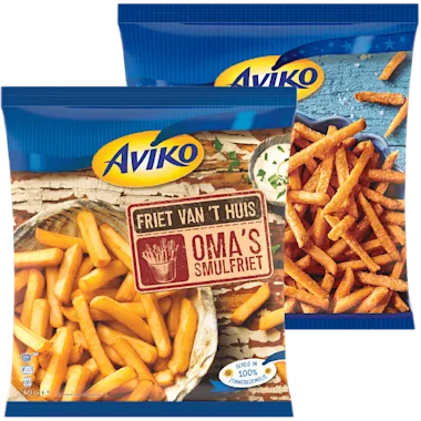 Aviko Wavy, grip 'n dip, schijfjes, zoete friet en friet van 't huis