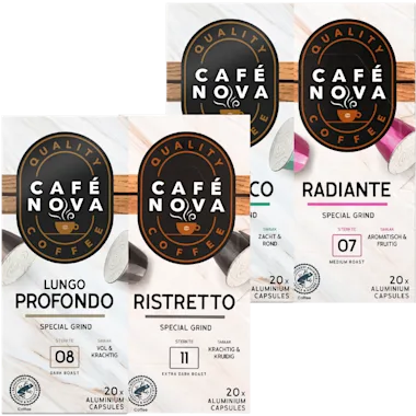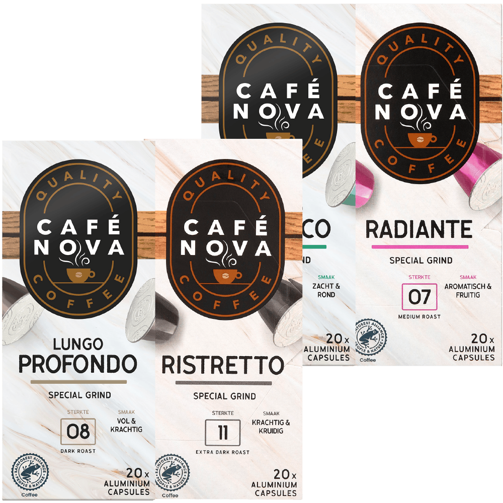 Bijv. Café Nova Koffiecups lungo profundo sterkte 8, 2 dozen à 20 stuks van 11.58 voor 5.79.