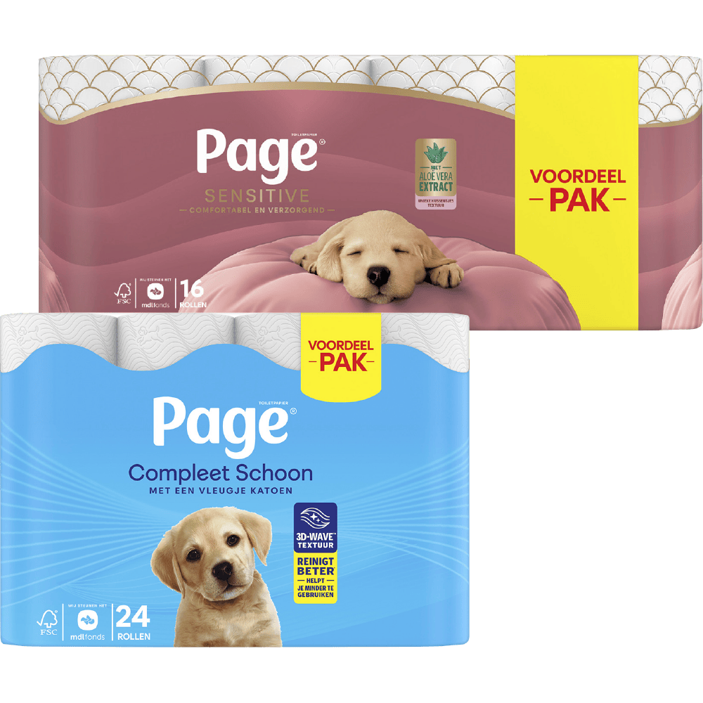 Compleet schoon Pak 24 rollen, recycled Pak 18 rollen en sensitive Pak 16 rollen