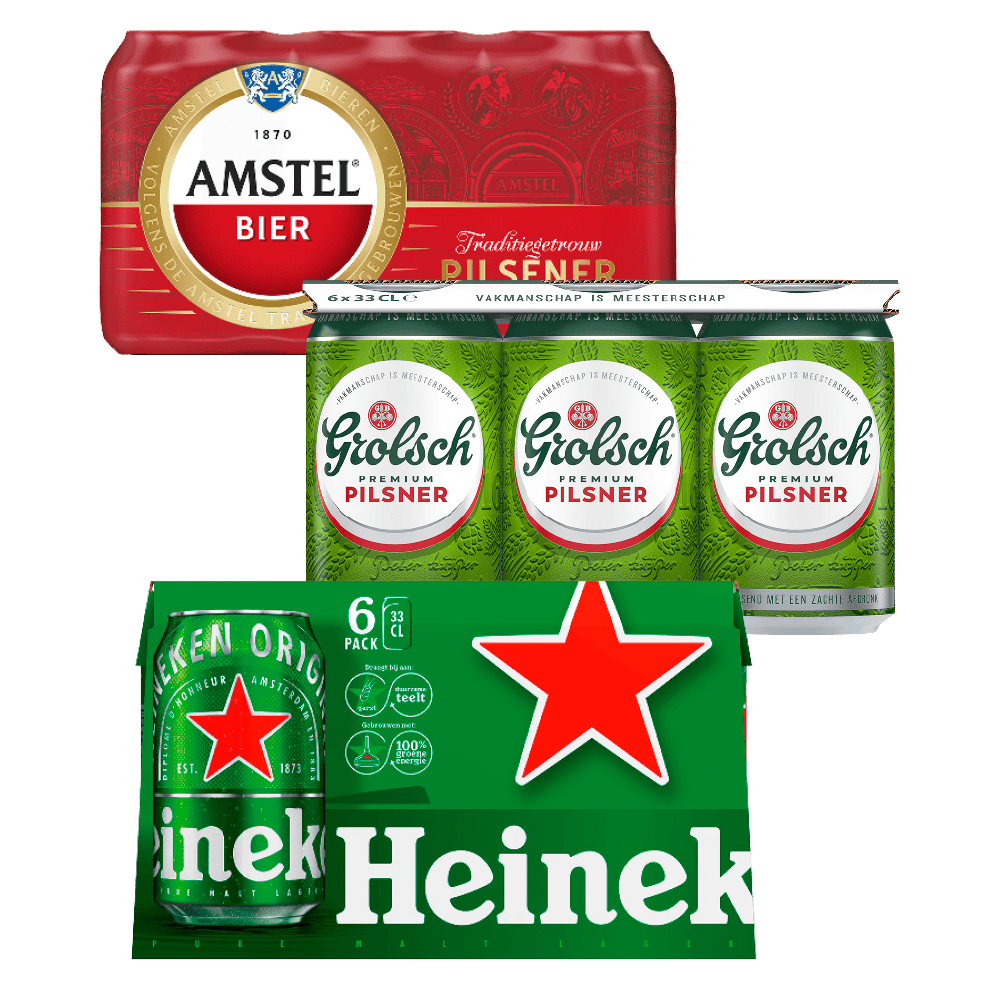 Bijv. Heineken Pils, set 6 blikjes à 30 cl van 6.99 voor 5.25.