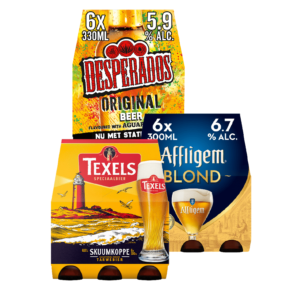 Alle flesjes en blikjes à 30-50 cl en sets M.u.v. gekoelde varianten