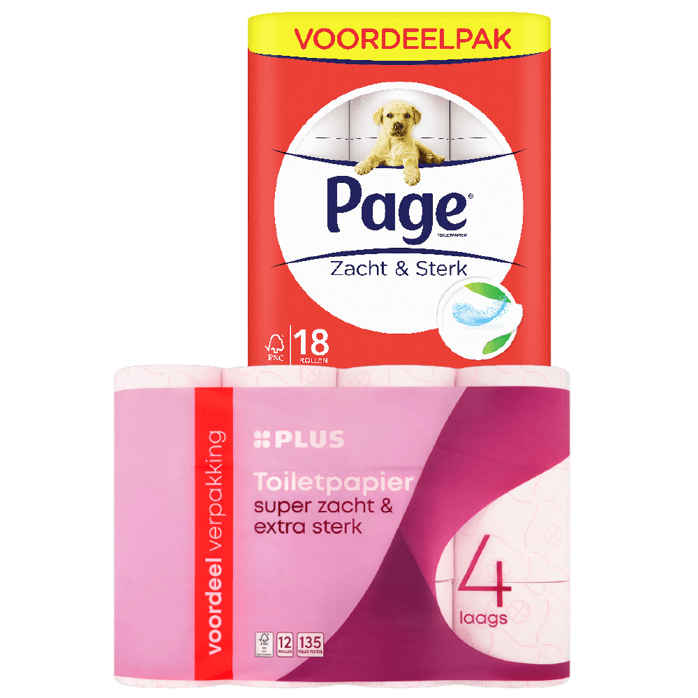 PLUS Toiletpapier 4-laags Pak 12 rollen en Page Toiletpapier zacht & sterk Pak 18 rollen OP=OP Per pak