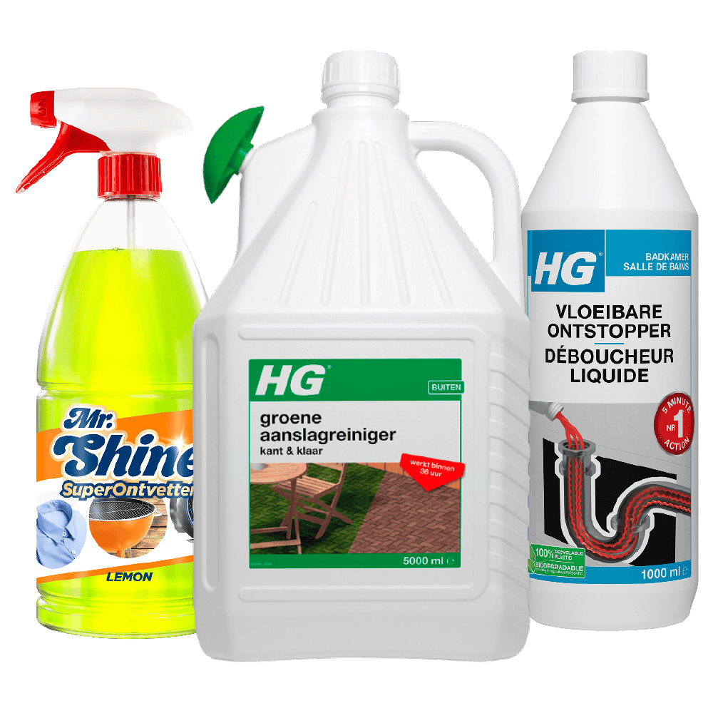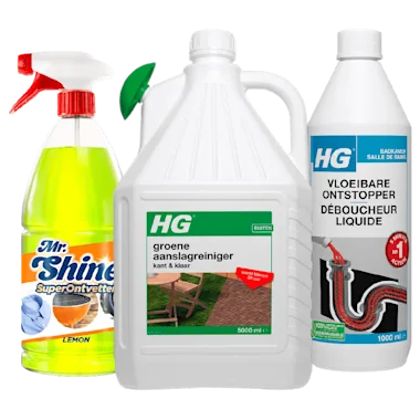 Bijv. HG Groene aanslagreiniger kant en klaar, fles 5 liter van 7.99 voor 5.99.