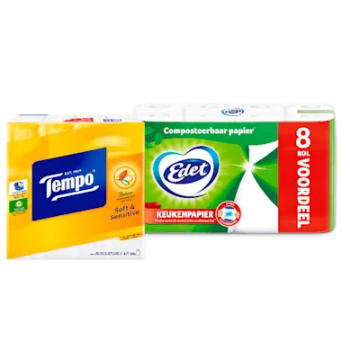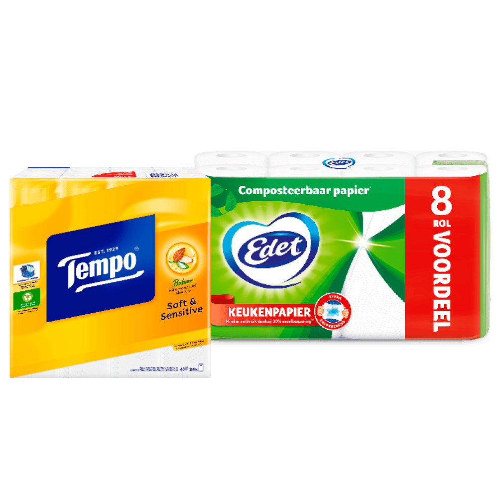 1+1 GRATISEdet Keukenpapier Alle varianten en Tempo Zakdoekjes Pak 24 en 30 pakjes OP=OP